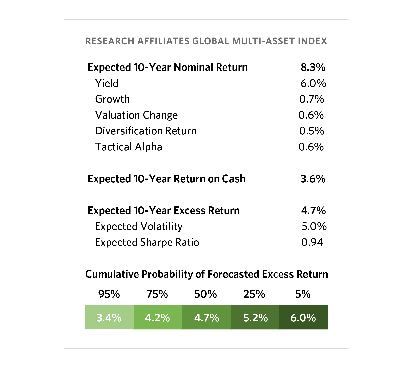 Note: All data presented herein are forward-looking estimates based on simulated portfolios computed by Research Affiliates, LLC, and do not reflect the performance of any product or strategy. Forward-looking statements are subject to numerous assumptions, risks, and uncertainties, which change over time, and speak only as of the date they are made. Research Affiliates, LLC assumes no duty to and does not undertake to update forward-looking statements. The data are based upon reasonable beliefs of Research Affiliates, LLC, but are not a guarantee of future performance. Actual results may differ materially.